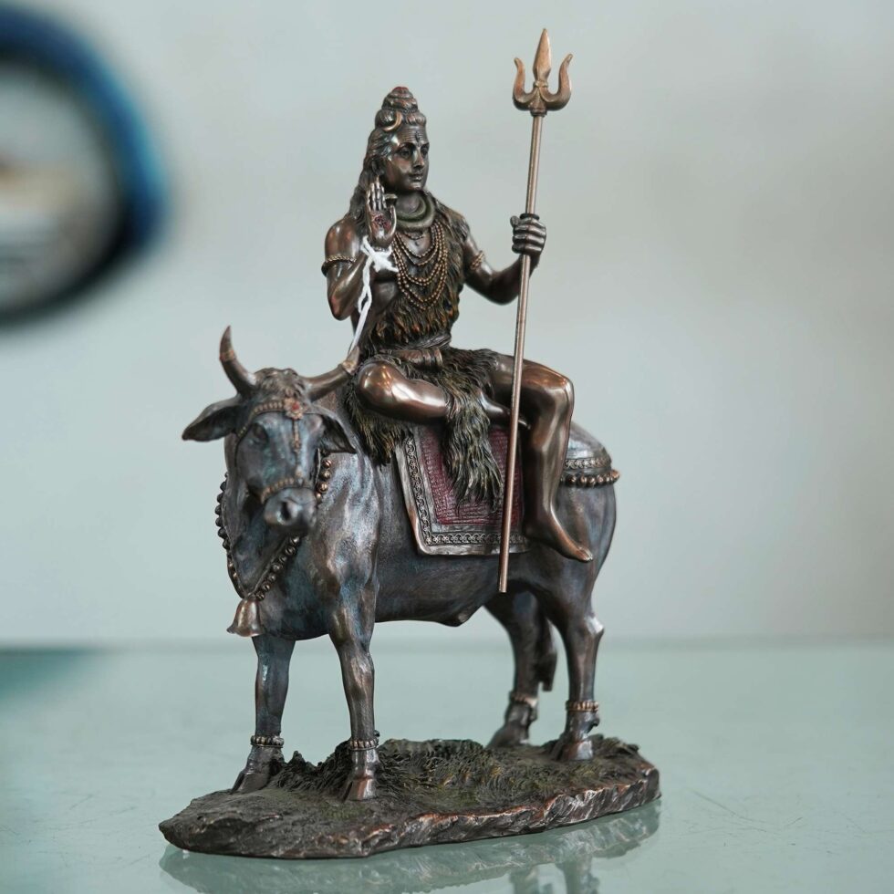 Shiva in Contemplation emphasizes the meditative state Shiva is often depicted in while riding Nandi.